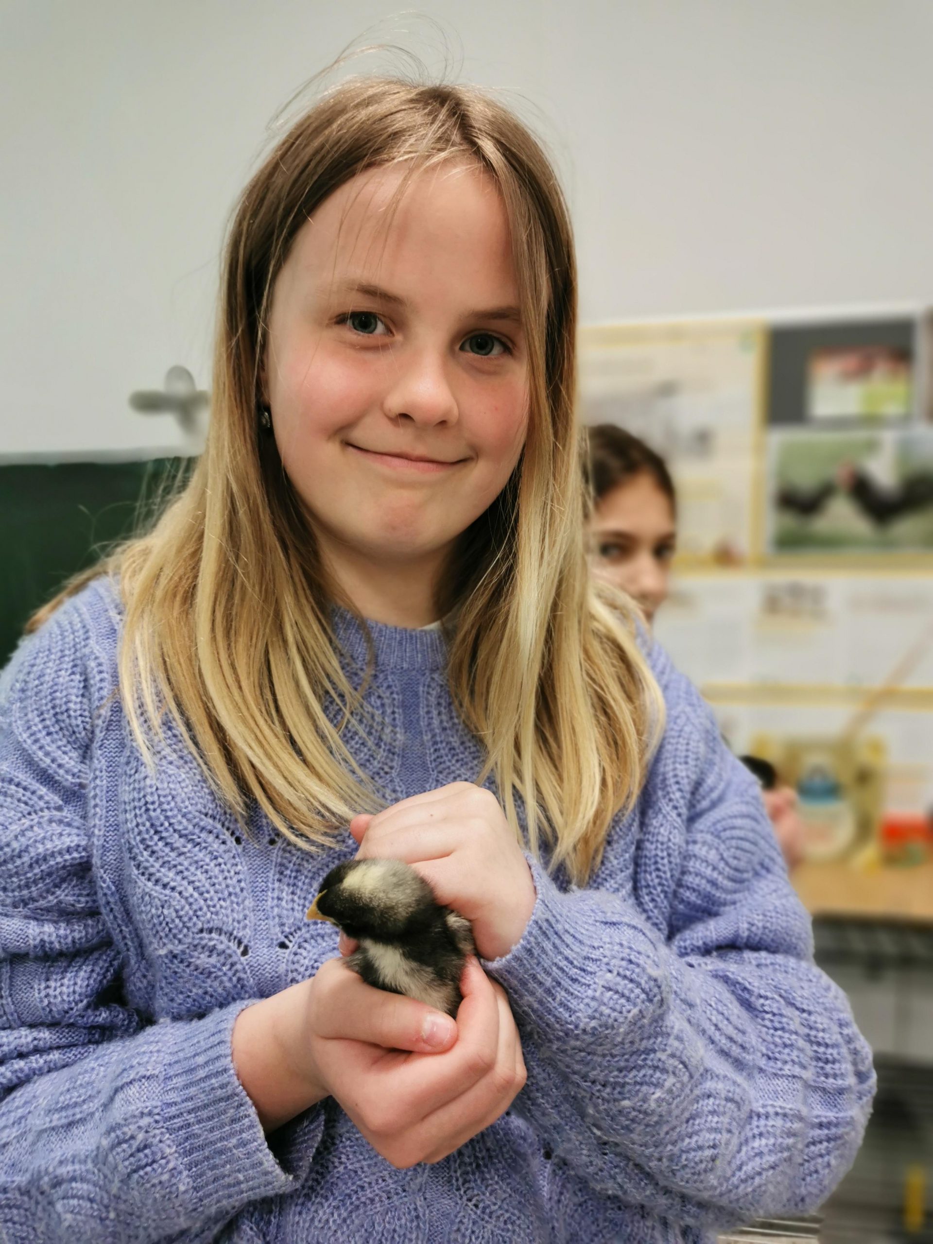 Wir haben uns sehr gefreut, als Frau Fischer reinkam und uns erzählt hat, dass wir Küken bekommen. Sie hat uns erklärt, wie das dann ablaufen wird. Sie erzählte, dass die Eier ca. 21 Tage brauchen, bis sie schlüpfen. Als nach 21 Tagen ein Küken geschlüpft ist, haben wir uns sehr gefreut, dass es geklappt hat. Als wir Frau Fischer angerufen haben, hat sie gesagt, dass sie so schnell wie möglich kommt. Sie hat einen Käfig mitgebracht und das Hühnchen aus dem Brutautomat geholt. Es hat die ganze Zeit